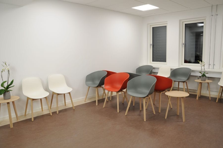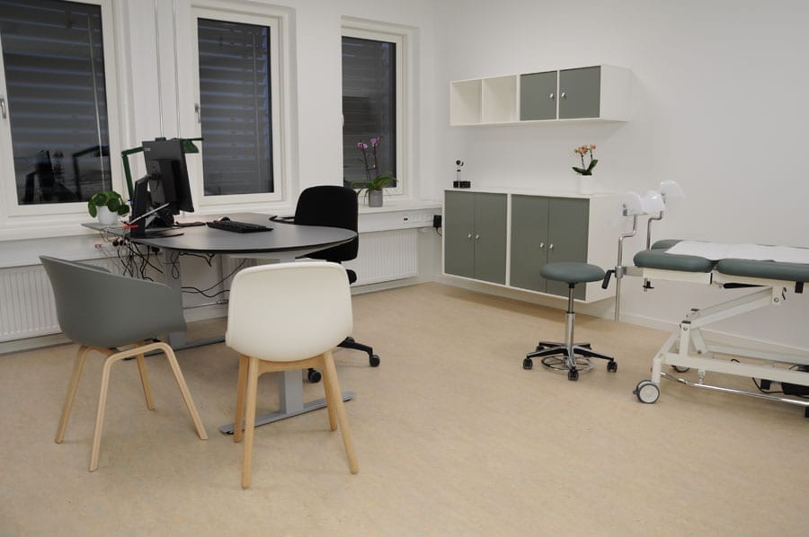 Heriblandt reception, venteværelsesmøbler, møbler til konsultation og sygeplejeklinik, skuffeskabe og FlexCare lejer.