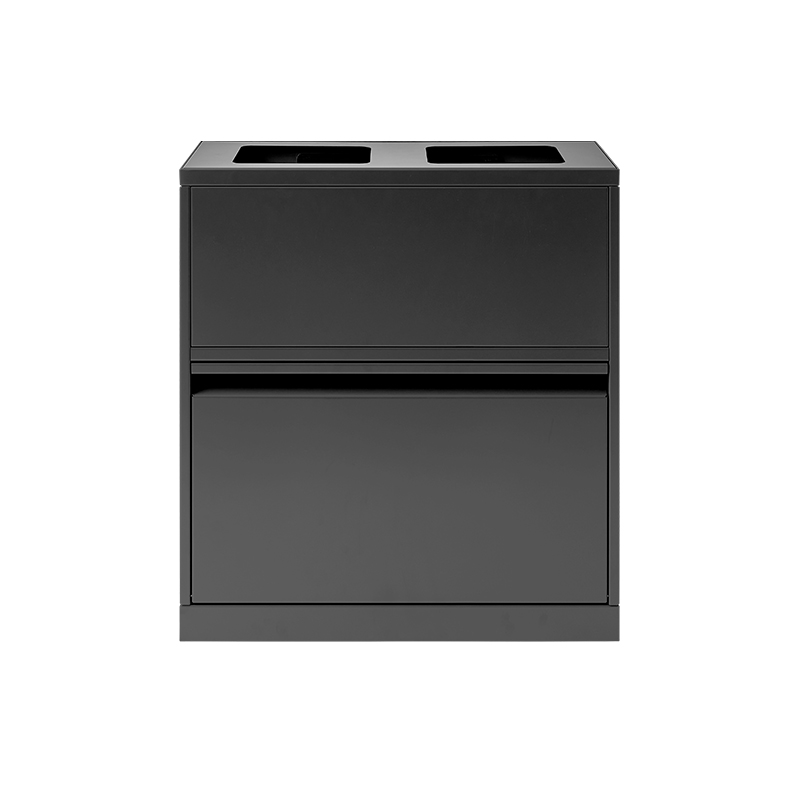 Affaldssystemet er udstyret med en skuffe med soft close for lydløs og rolig lukning. Affaldssystemet kommer med inderbeholdere udstyret med håndtag for nem håndtering ved tømning. Låget skjuler inderbeholderne og poserne, så affaldssystemet bevarer et stilrent design. Affaldssystemet er flytbart takket være de monterede hjul, som er skjult bag soklen.