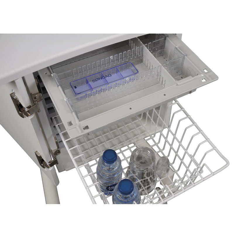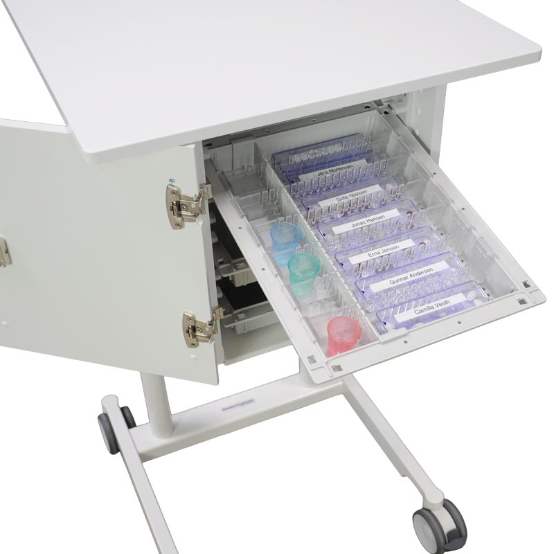 Praktisk og nem vogn til opbevaring og uddeling af dagens medicin, så det er nemt at have medicinæskerne med rundt.