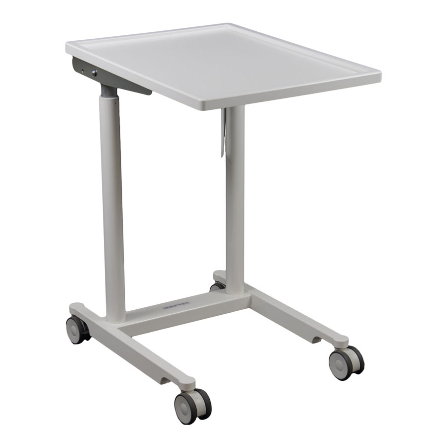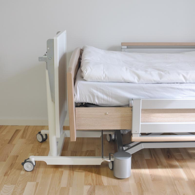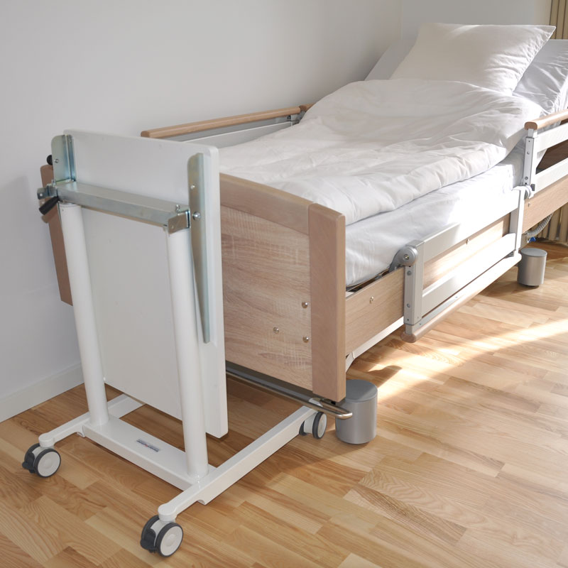 Hæves og sænkes nemt uden strøm. Plejebordet er nemt at spritte af og stille ved sengegavlen når det ikke er i brug.