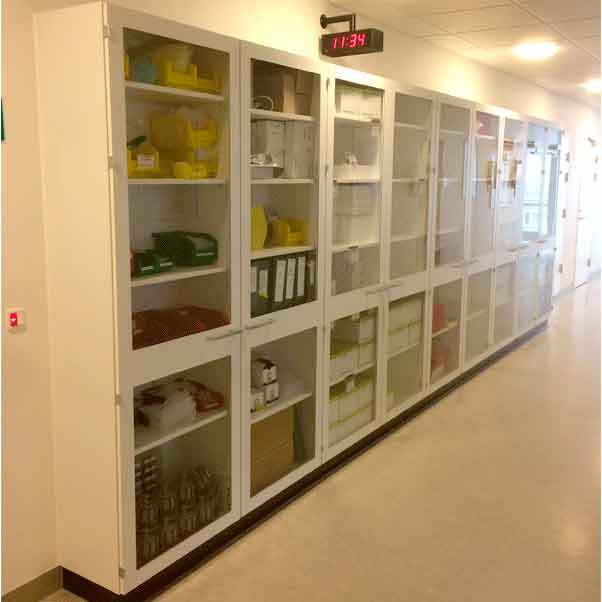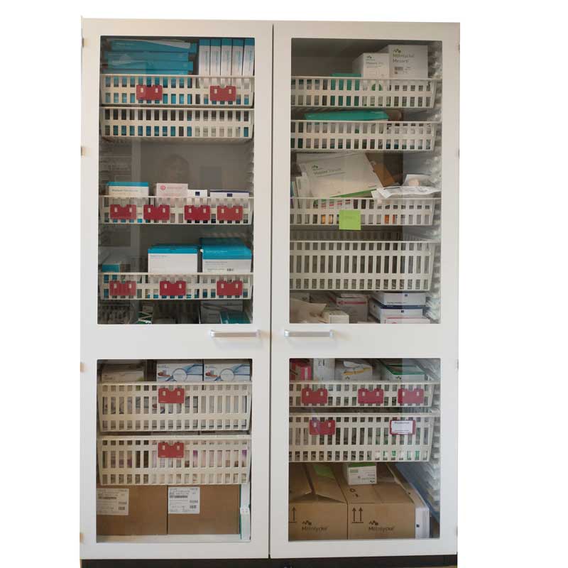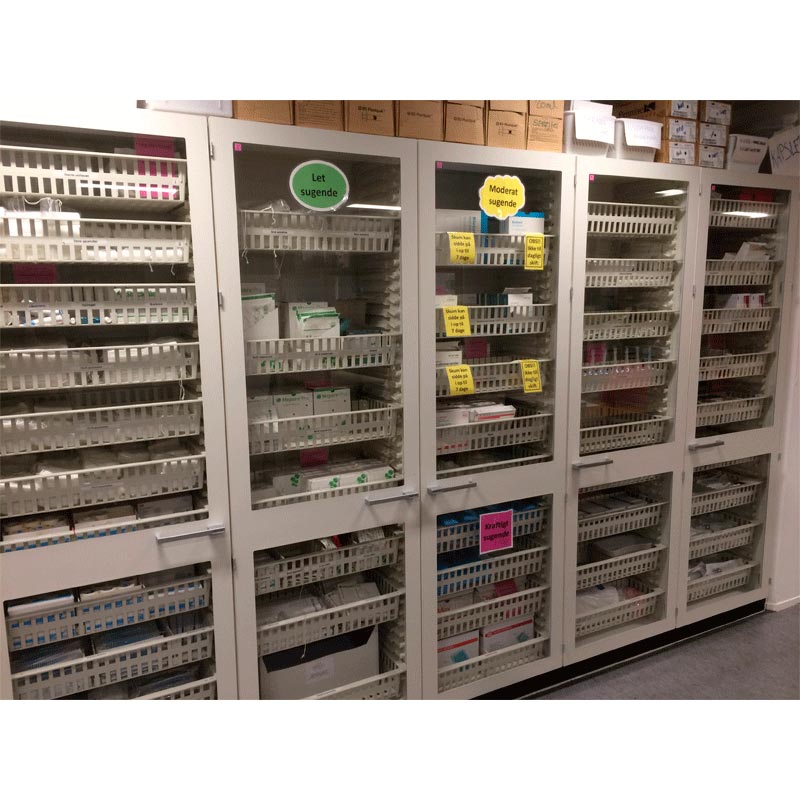 - Indretningen af depotskabene anbefales, så lignende produkter findes i nærheden af hinanden. Fx sårbehandling: absorberende bandager, skumbandager, kompresser. Det skaber overblik og reducerer tidsforbrug, når man skal finde de rette produkter.