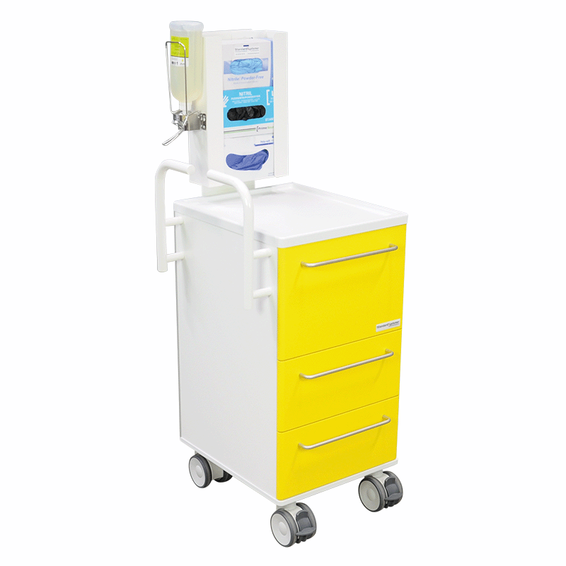 Smittevognen er indrettet, så der er god plads til værnemidlerne: overtrækskitler, mundbind, øjenbeskyttelse og handsker. Den gule farve er klar, uden at være prangende og gør, at man bliver bevidst om ekstra opmærksomhed.