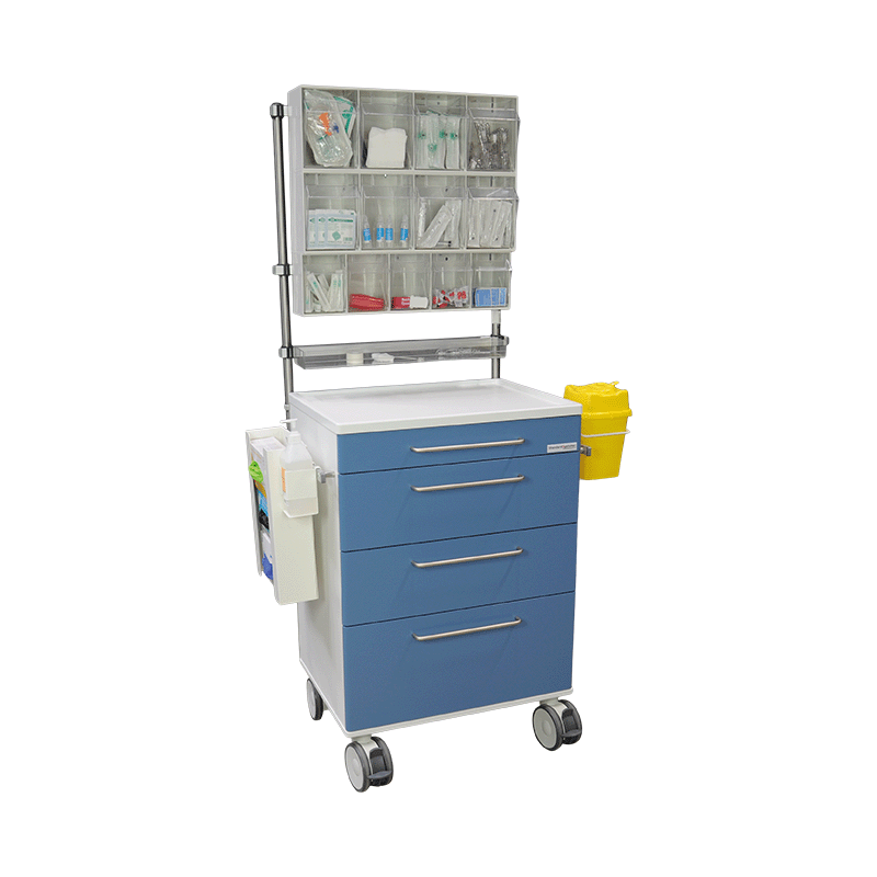 - Stor akutvogn, hvor overbygning med klare vippeskuffer gør det nemt at finde udstyret.