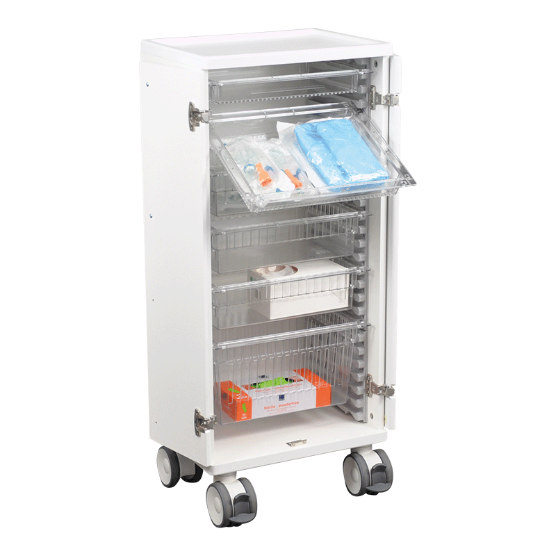 Vores klinikvogne indrettes og tilpasses, så skuffer og skabes størrelser passer præcis til indholdet alt efter jeres rutiner og arbejdsgange. Indholdet i skufferne kan skræddersys efter specifikke opgaver og ønsker, samt tilpasses de optimale indlæg til behandlingsprocesser.