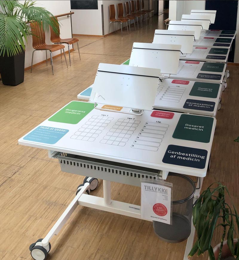 Medicindoseringsbord til sikker, systematisk og ergonomisk medicindispensering. Bordet måler 60×100 cm og kan nemt placeres et sted, hvor der er arbejdsro. Bordet har alle de ting, der skal bruges til medicindoseringen. Det er effektivt, sikkert og hygiejnisk.
